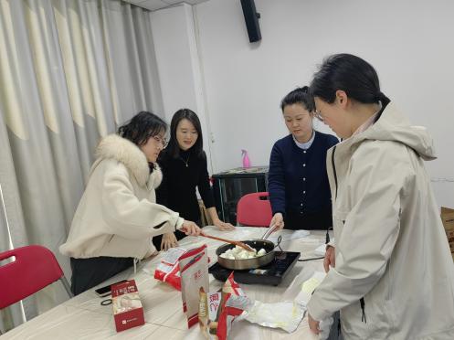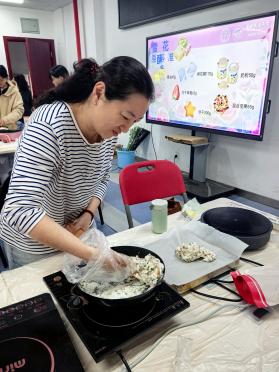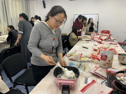 老师们热情高涨,纷纷化身“甜点大师”。大家分工协作,有的负责熬制黄油,有的负责分装食材,现场气氛热烈而有序。为了确保活动顺利开展,许多老师更是从自己家中带来了电磁炉、不粘锅、硅胶铲等专业工具,充分展现了集体的智慧与团结协作的精神。