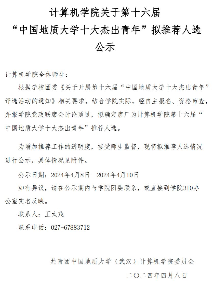 BBIN宝盈集团官网首页关于第十六届“中国地质大学十大杰出青年”拟推荐人选公示