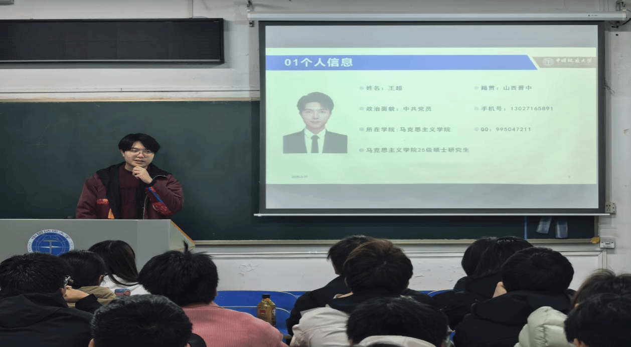 兼职辅导员王超进行自我介绍,他表示新的学期将以饱满的热情投入学院学生工作。同学们纷纷表示欢迎。