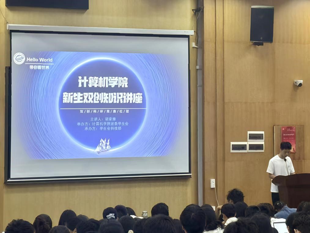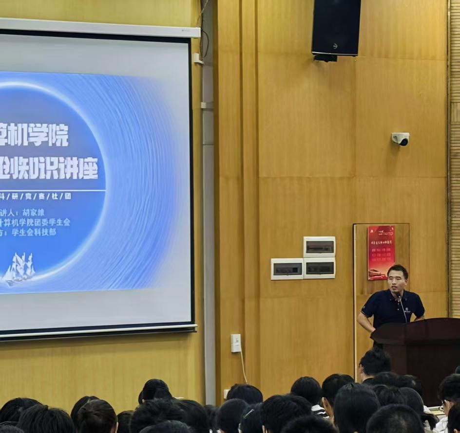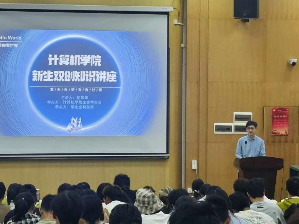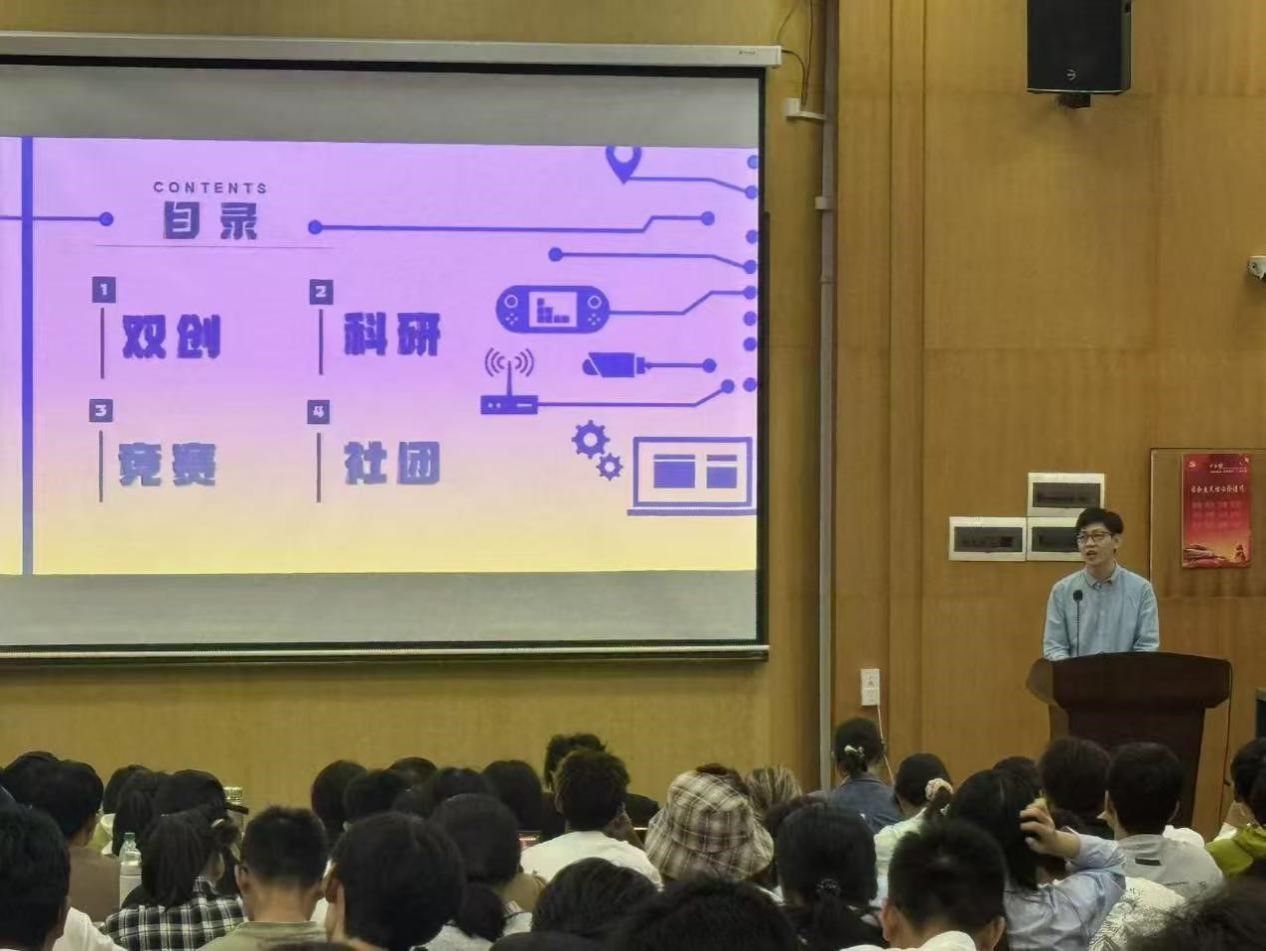 随后,科技部副部长胡家维同学围绕双创、科研、竞赛与社团活动四个维度,为在场同学带来详实的内容分享。他详细阐述了“双创”活动的相关内涵以及其对未来发展的潜在意义,并鼓励大一新生将科技论文报告会作为开启大学科研实践的第一站,引导他们积极参与到科技活动中去。此外,他还介绍了学院支持的多项科技竞赛,包括ACM程序设计竞赛、CTF网络攻防比赛等,并指出这些平台不仅为团队协作和自我展示提供了宝贵机会,还能锻炼同学们的实践能力与创新思维。最后,胡家维同学向大家介绍了ACM协会、网安协会、智能基座协会等科技类社团,鼓励新生在专注学业的同时,踊跃参与课外实践,实现学术交流、技能拓展与兴趣培养的全方面发展。