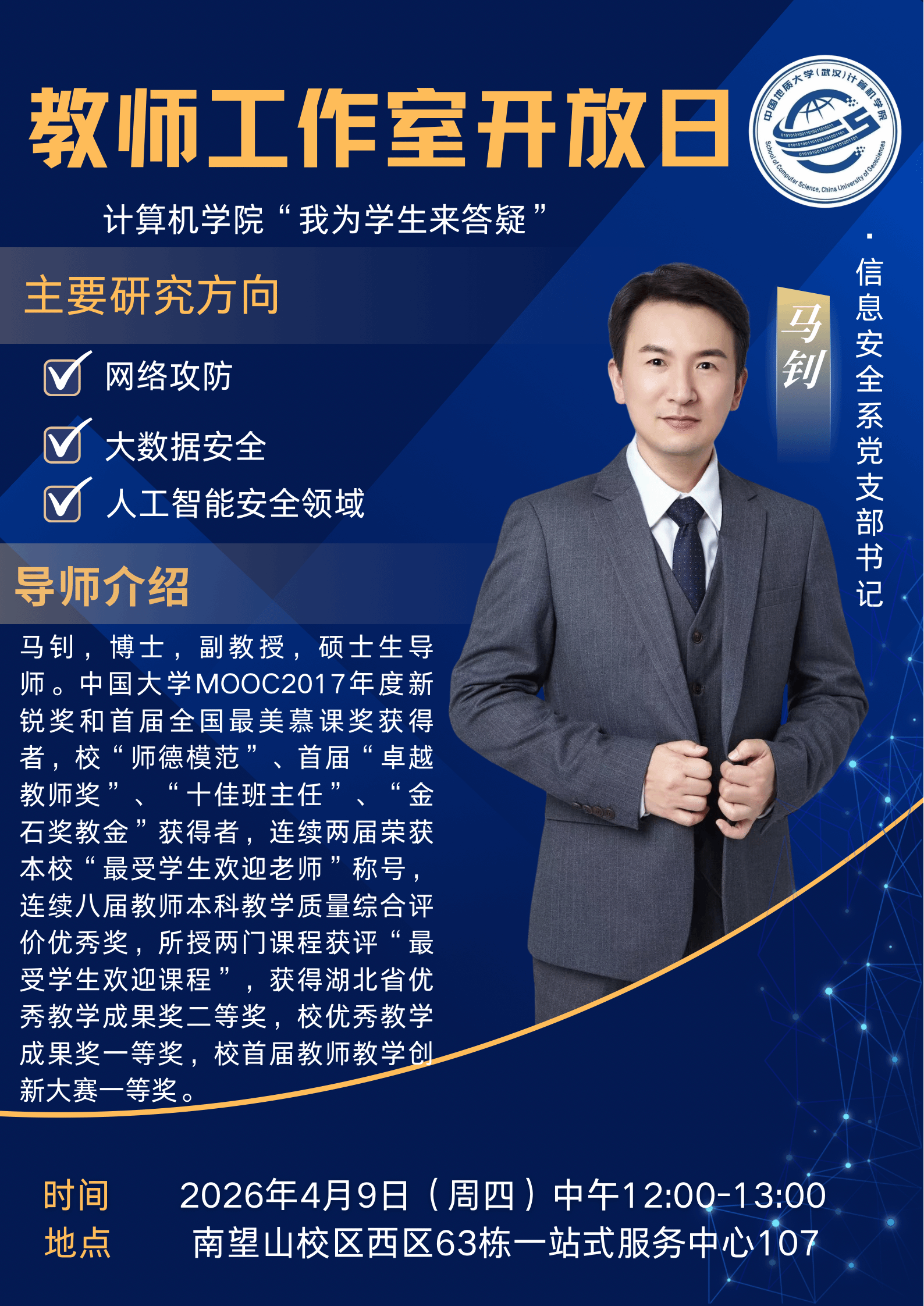 活动伊始,辅导员谭文博详细介绍了本次开放日的活动目的、流程,并隆重介绍了深耕网络攻防、大数据安全、人工智能安全领域,教学科研经验丰富的马钊老师,为后续交流环节拉开序幕。