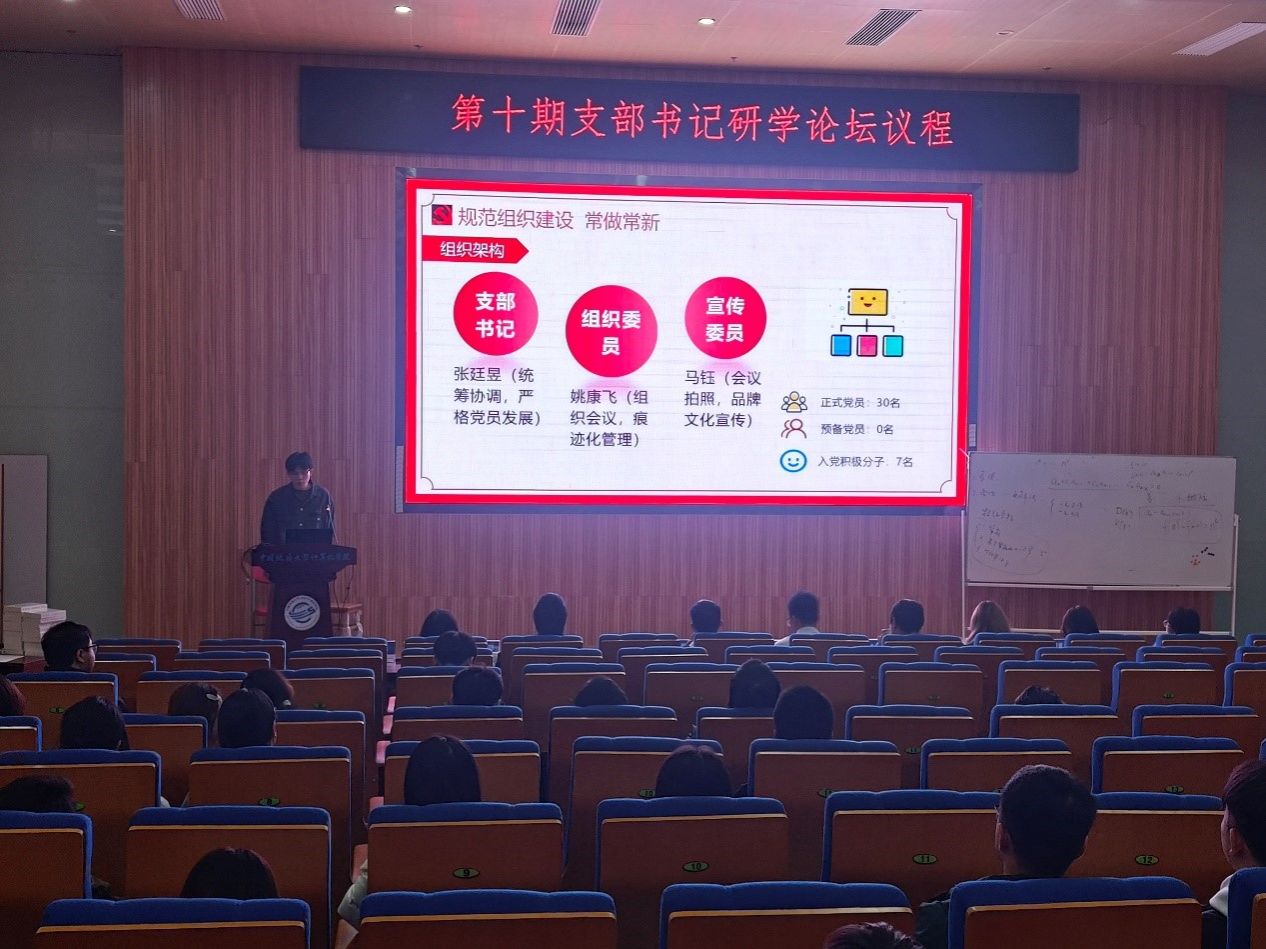 为深入贯彻落实党的二十届三中全会,进一步提升党支部书记的政治素养和工作能力,充分发挥党支部战斗堡垒作用,10月22日,学院举办第十期支部书记研学论坛。研究生辅导员丁鑫磊、党建兼职辅导员王腾帆、学生党建办公室副主任巴特沙汗,以及全体学生党支部书记、学生党建办公室成员、2025级研究生全体党员参与,围绕2024年度党建创新成果、主题党日工作与党员示范引领等展开深入研讨。学院党建辅导员谭文博主持论坛。