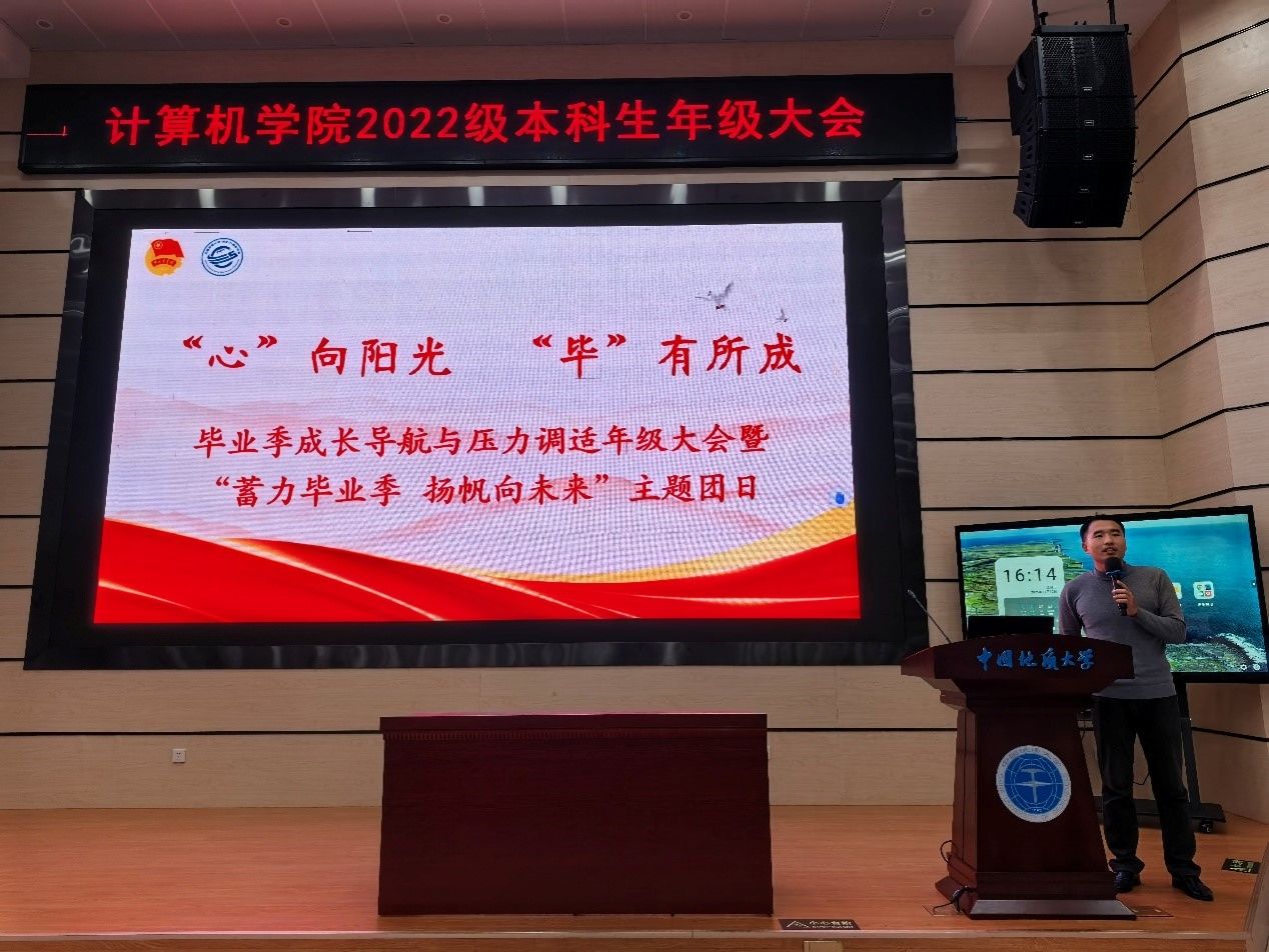 为引导大四学子树立积极健康心态,科学调整及坚定未来发展路径,11月13日下午,我院2022级本科生“‘心’向阳光 ‘毕’有所成”毕业季成长导航与压力调适年级大会暨“蓄力毕业季 扬帆向未来”主题团日活动在未来城校区公教一208教室顺利举行。学生心理健康教育中心王煜、学院教务科李婷、辅导员王太茂及2022级在校本科生参加,会议由王太茂主持。