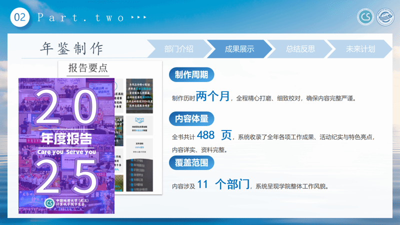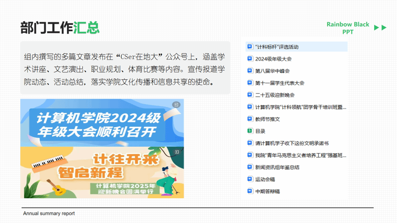 办公室作为团学组织的“中枢枢纽”,统筹协调各项行政工作,累计组织团委学生会会议8次、整理会议记录8份,审核活动场地预约600余次,编撰488页年鉴全书,打造特色活动,全力保障团学工作高效有序运转。