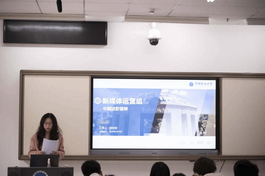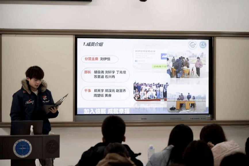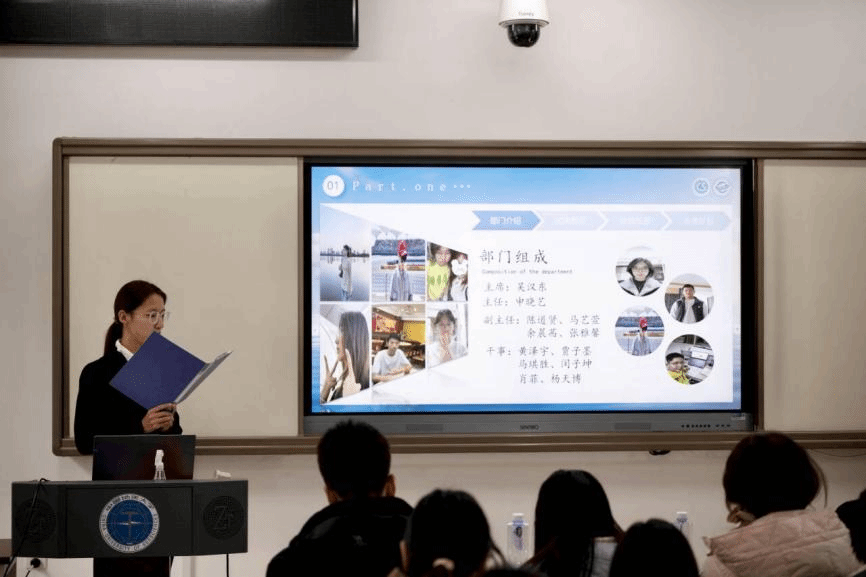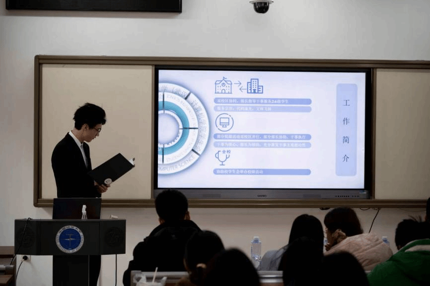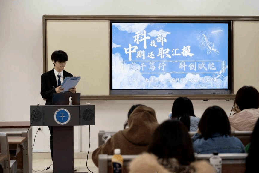 答辩现场,由学生会主席团成员吴汉东主持,组织部、志愿者协会、全媒体中心各工作组、信息调研与权益服务中心、文体部、办公室、科技部、学风部各部门负责人进行依次汇报。
