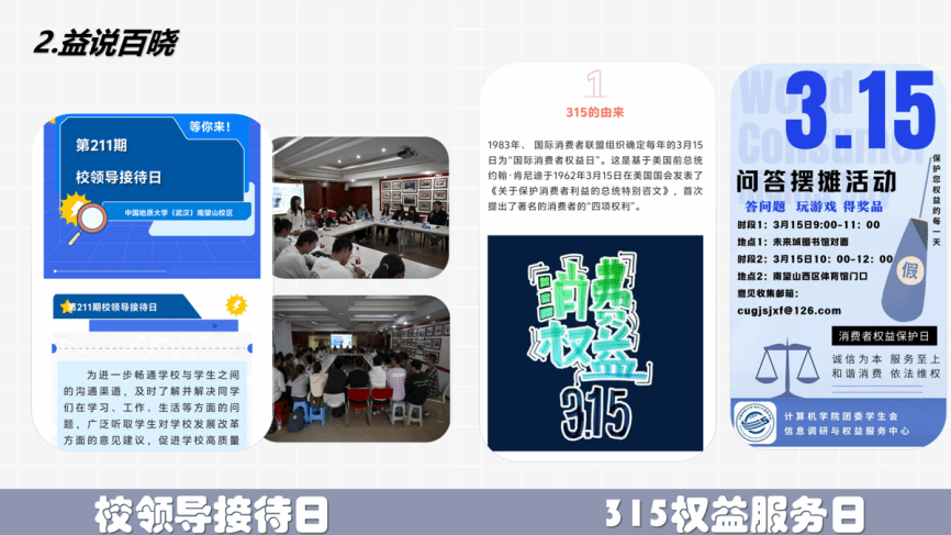 信息调研与权益服务中心立足学子需求,统筹学生信息调研与权益保障,设立双渠道权益信箱、打造“益呼百应”、“益说百晓”、“益吐为快”等特色栏目,组织信调大赛、315 维权日等活动,及时回应学子诉求、传递同学心声。