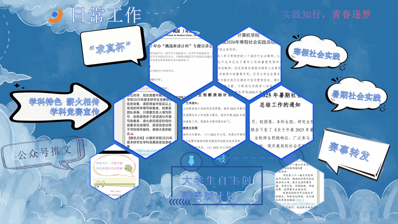 学风部深耕学风建设与青年成长,打造“新生入学指南”“计科E课堂”“保研分享会”“宿舍文化节”等特色活动,其中“计科E课堂”参与人数突破300人,活动满意度超90%。通过榜样引领、经验分享,引导学子树立优良学风、明确成长方向。