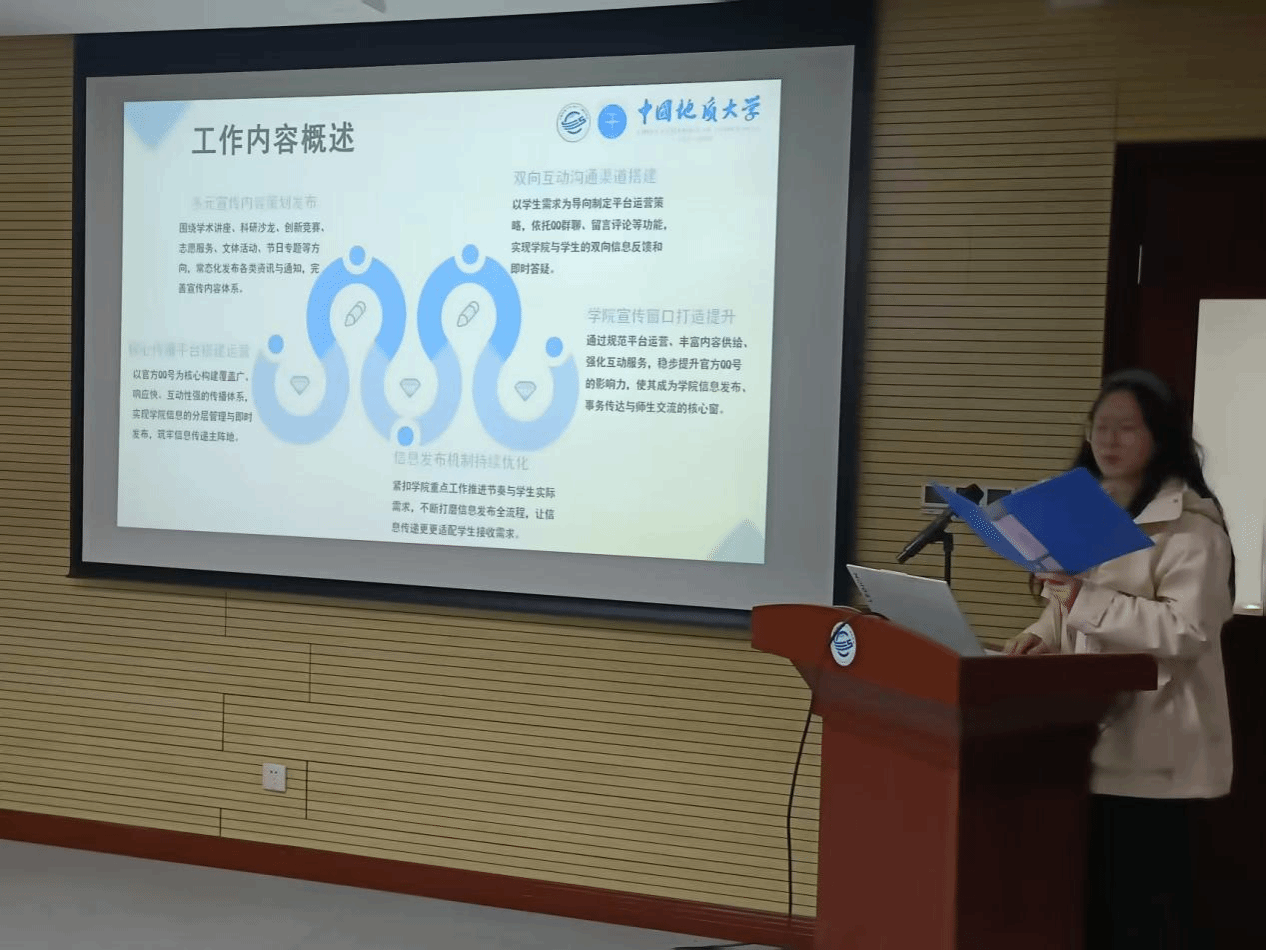 随后,团委学生会办公室、学风部以“以办筑基强效能,以学立品展风采”为主题进行述职。他们不断完善办公室运行机制,优化学风部活动流程,深刻反思统筹前置不足、节奏把控不强、品牌整合不够等问题,提出完善预案、节点管控、构建学风活动矩阵等改进措施,推动工作提质增效。