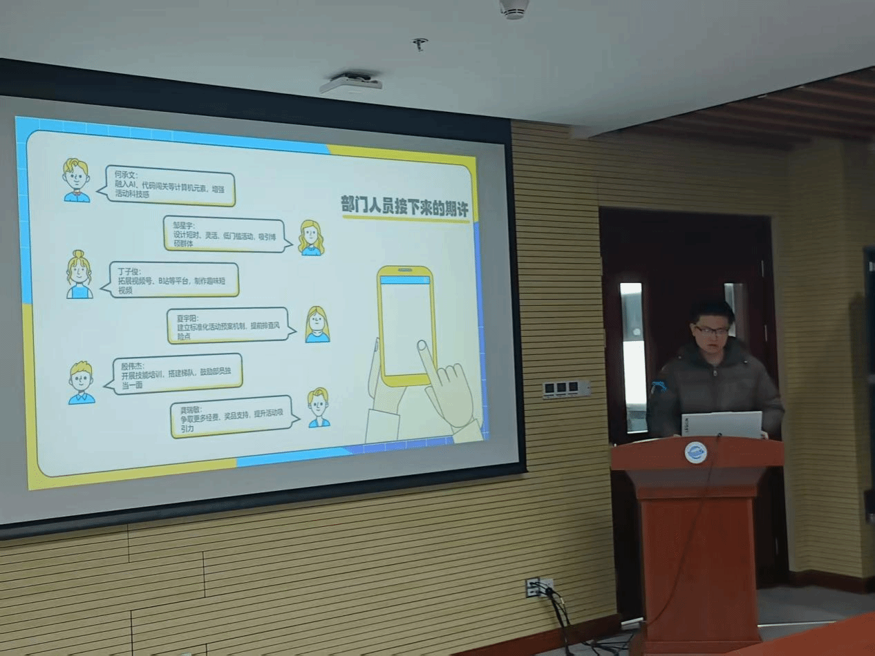 最后,团委学生会文体部以“以责任凝聚力量,用行动书写担当”为主题进行述职。通过数据与图片展示举办的元旦晚会、计科杯、新生杯、校运会等18项大型文体活动。他们反思不足,并提出继续办好经典赛事,不断创新活动形式的规划,提升活动参与度。