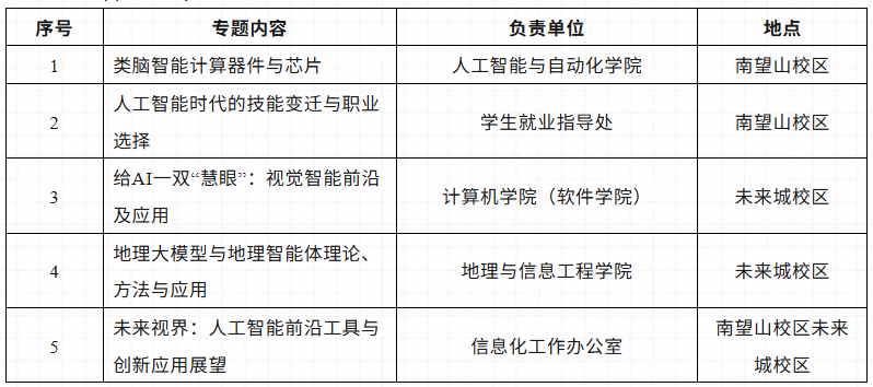 1.人工智能科普讲座:围绕人工智能基本原理、前沿动态、伦理安全及行业应用等主体开展讲座,帮助学生构建知识框架。具体安排见附件1。